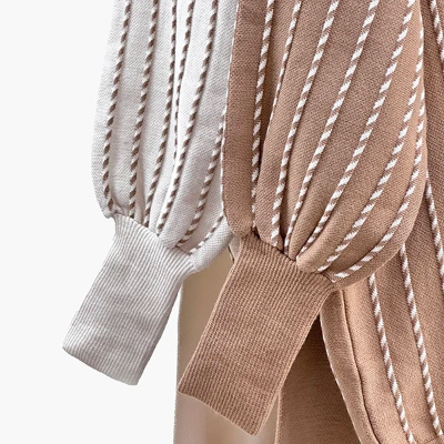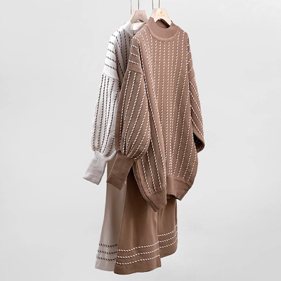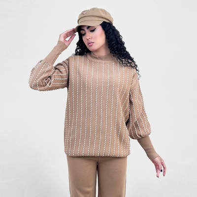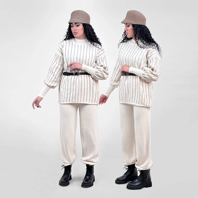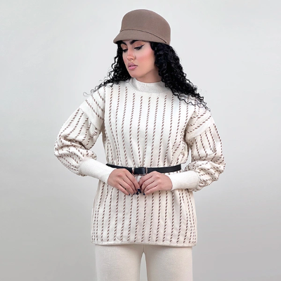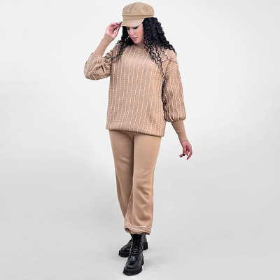 این ست بافت زیبا، طرح راهداری از جنس خود بافت داره که باعث شده جلوهی جذابتر و کشیدهتری رو به استایلتون بده. این بافت زیبا مناسب فصل پاییز و صبح تا عصرای سرد زمستونیه که میتونی همه جوره استایلش کنی. علاوه بر سادگی خیلی شیک و زیباست. یقه، دم آستین و پایین بلوز کشبافت هست و مدل شلوار واید و آزاده. این ست براحتی با بوت و کفشای اسپرت استایل میشه. دوتا رنگ شیک و نوود داره. شیری و نسکافه ای که میدونم همهی دخترای شیک عاشق این دو رنگ هستن. این ست جذاب فری سایزه و دوخت آزادی داره که از سایز 36 تا 42 رو براحتی پوشش میده. برای دیدن اندازه های دقیقش راهنمای جدول سایز این ست رو حتما چک کن.