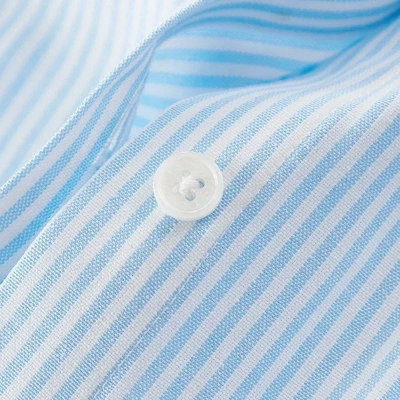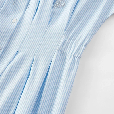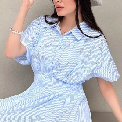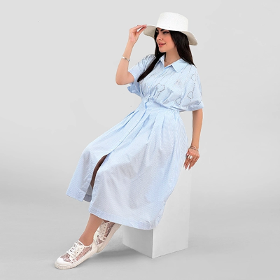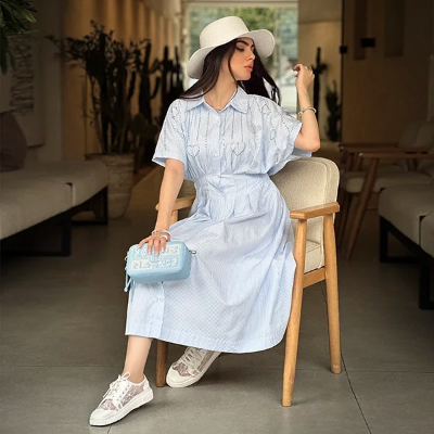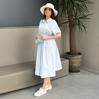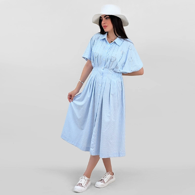پیراهن زنانه آبی بسیار شیک، مناسب استایل ساحلی و راحت برای روزهای گرم تابستان. این پیراهن بسیار شیک و جذاب از برند شین از جنس نخ میباشد و بسیار سبک و راحت و خنک و مناسب فصل بهار و تابستان است. پیراهن تک رنگ و به رنگ آبی روشن است که روی پارچه آن طرح راه راه سفید دارد. همین پارچه زیبا و ساده باعث شده لباس به راحتی با هر اکسسوری و کیف و کفش مناسب فصل، ست شود و یک استایل متفاوت و شیک را به شما بدهد. جلوی پیراهن از بالا تا پایین دکمه میخورد که این طراحی حس راحتی و خنکی بیشتری رو به شما میدهد. سایزبندی پیراهن از 34 تا 42 میباشد همچنین کمر آن کشی و قابل انعطاف است.
