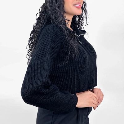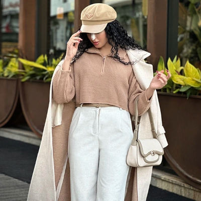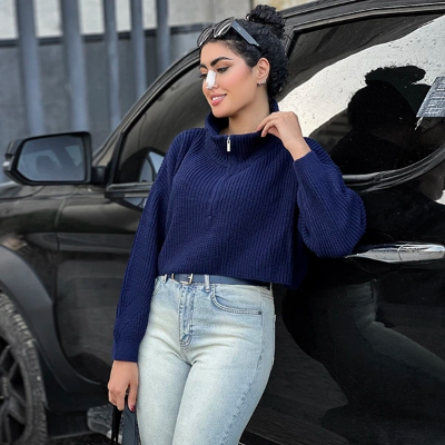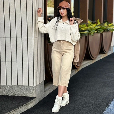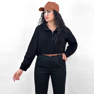 این کراپ بافت طراحی خیلی شیکی داره، یه یقه شکاری داره که یه نیم زیپ خوشگل اونو تنظیم میکنه و بهش جلوه میده. قدش تا روی کمر میاد که میتونی راحت با شلوارای فاق بلند که خیلی ترند هستن ست کنی. چهارتا رنگ جذاب و پاییزه داره، شیری، کرم، مشکی و سورمهای که همگی قابلیت ست شدن با انواع شلوار رو دارن. این کراپ فری سایزه و اندازه آزادی داره. بخاطر همین از سایز 36 تا 42 رو راحت پوشش میده. اما میتونی اندازههای دقیقش رو توی جدول سایزش مشاهده کنی.